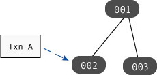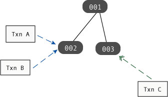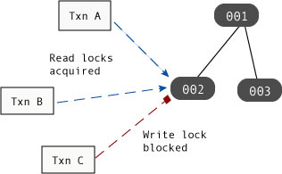 In the following figure, Txn A and Txn B are both holding read locks on page 002, while Txn C is holding a write lock on page 003: